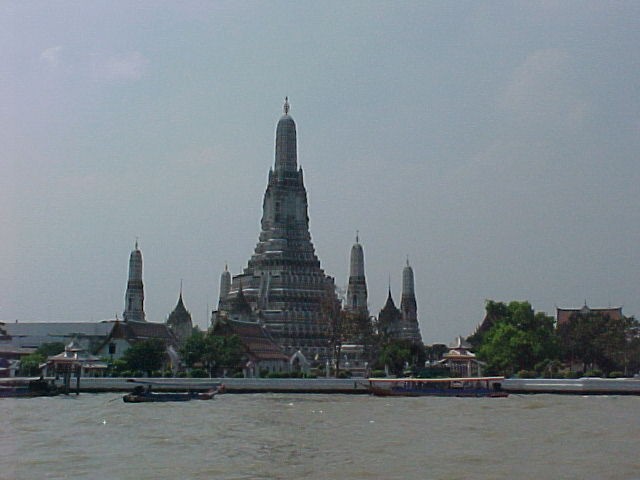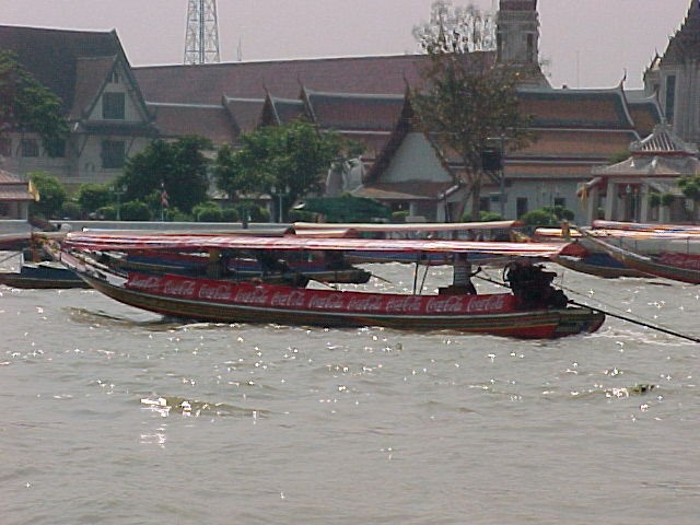 There are many temples that can be seen from the river like the one on the left. On the right is a long boat -- a mode of travel -- covered in Coca-Cola advertising.